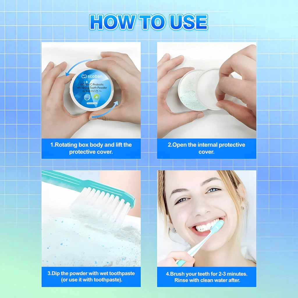 ✨ Scoban Vitamin C Probiotic Whitening Tooth Powder — your daily essential for whiter teeth, fresher breath, and a healthier, brighter smile!