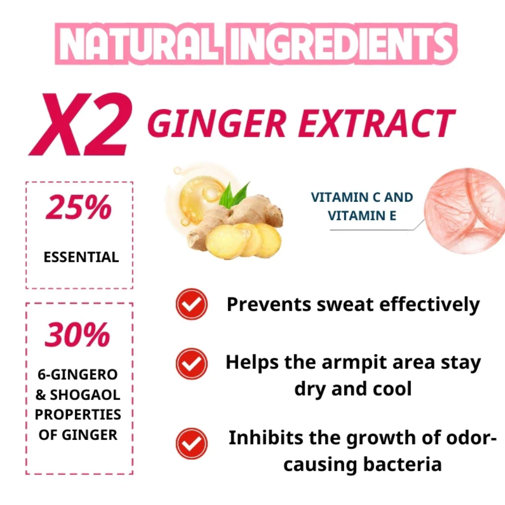 - Ingredients: Niacinamide; Glutathione; Ginger Essence; Aluminum Salt; water, ethanol, aluminum oxychloride, hydroxyethyl cellulose